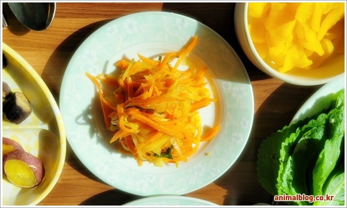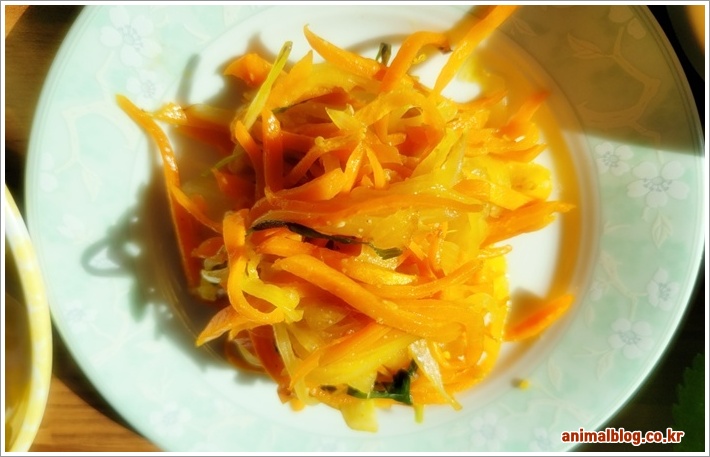 1. 당근을 껍질을 벗기고 가늘게 채썬다.